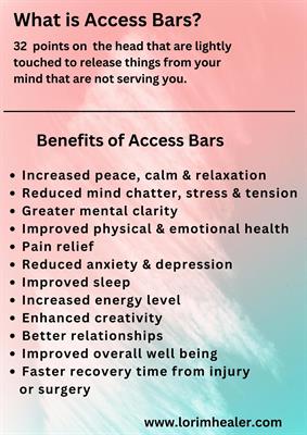 Access Bars® is a hands-on healing process that helps to create more happiness, joy, and ease in your life. The Bars are 32 points on the head that relate to different areas of your life such as money, control, creativity, aging, healing, joy, and communication.